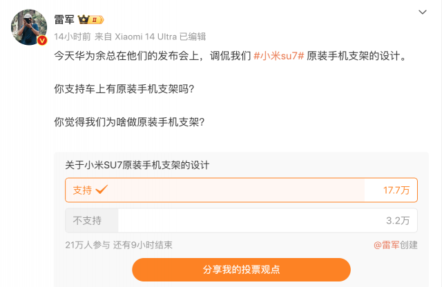 随后,雷军在微博发文称,今天华为余总在他们的发布会上,调侃我们小米SU7原装手机支架的设计。同时,他还提问并发起投票,“你支持车上有原装手机支架吗?你觉得我们为啥做原装手机支架?”