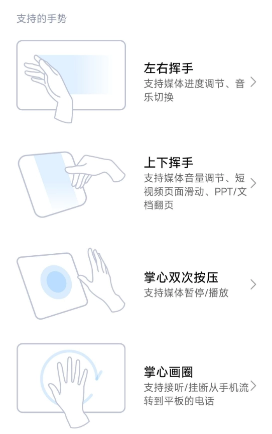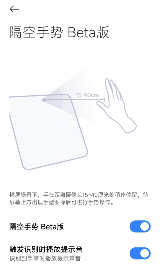 根据网上流传的设置界面信息,隔空手势 Beta 版需要手在距离摄像头 15~40 厘米处稍作停留,待屏幕上方出现手型图标后可进行手势操作,包括左右挥手、上下挥手、掌心双次按压、掌心画圈等。