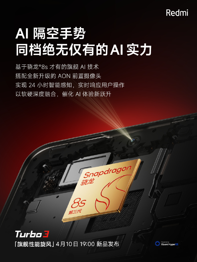 据介绍,Redmi Turbo 3 支持 AI 隔空手势,基于高通骁龙 8s Gen 3 芯片的旗舰 AI 技术,搭配全新升级的 AON 前置摄像头 实现 24 小时智能感知,实时响应用户操作。小米宣传其为“同档绝无仅有的 AI 实力”。
