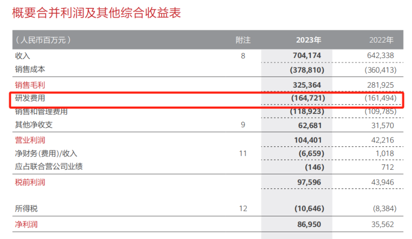 可供参考的是,中国科技巨头里,2022年,小米、百度阿里研发费用分别为160.28亿元、233.15亿元、567.44亿元,三家加起来也就比同期华为的一半略多。
