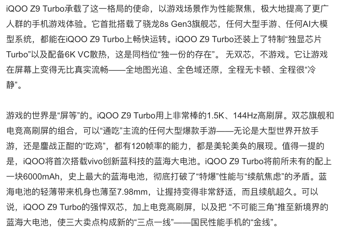 vivo 品牌副总裁贾净东在微博发布长文,提到 iQOO Z9 Turbo 首批搭载了骁龙 8s Gen3 旗舰芯,还装上了特制“独显芯片 Turbo”以及配备 6K VC 散热,这是同档位“独一份的存在”。屏幕方面 iQOO Z9 Turbo 采用了 1.5K、144Hz 电竞高刷屏的组合