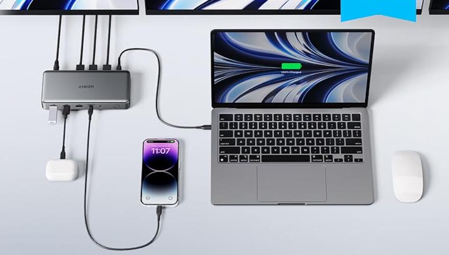 在充电方面,Anker 10合1 USB C扩展坞同样表现出色。它支持高达100瓦的功率输出,足以满足大多数USB-C笔记本电脑的充电需求,包括最新的MacBooks。同时,用户还可以通过30W USB-C电源传输端口为手机等移动设备充电,实现一机多用的便捷性。