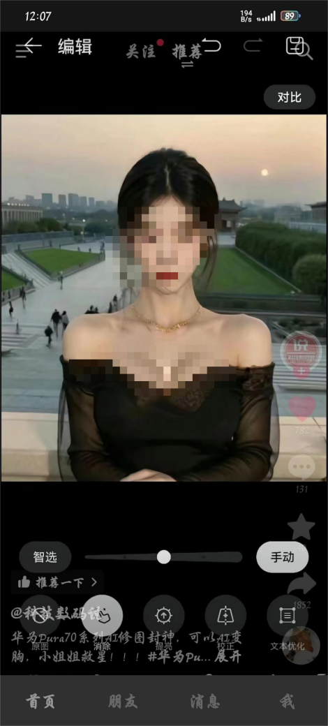该事件的起因是,有网友在网络平台中晒出利用华为 Pura 70 Ultra 手机图库 AI 消除功能,对照片中的女生胸口处衣服进行涂抹的场景演示。