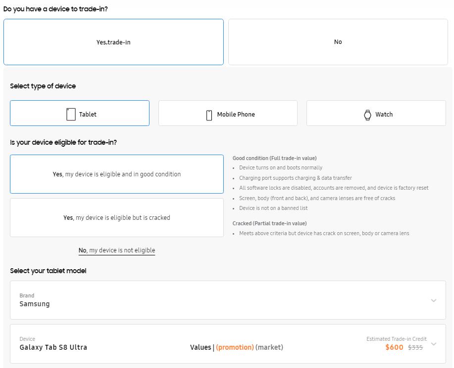 优惠内容有三星优惠计划,最高优惠20%,也就是160美元。另外还有以旧换新活动,最高折价达600美元,算下来一共优惠760美元。