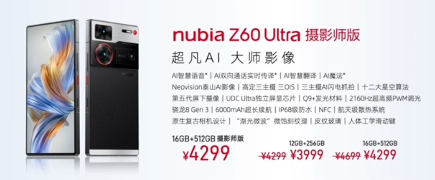 努比亚 Z60 Ultra 摄影师版 16GB + 512GB 定价 4299 元。此外,努比亚 Z60 Ultra 标准版机型开启优惠。