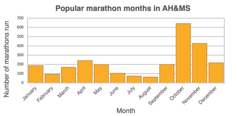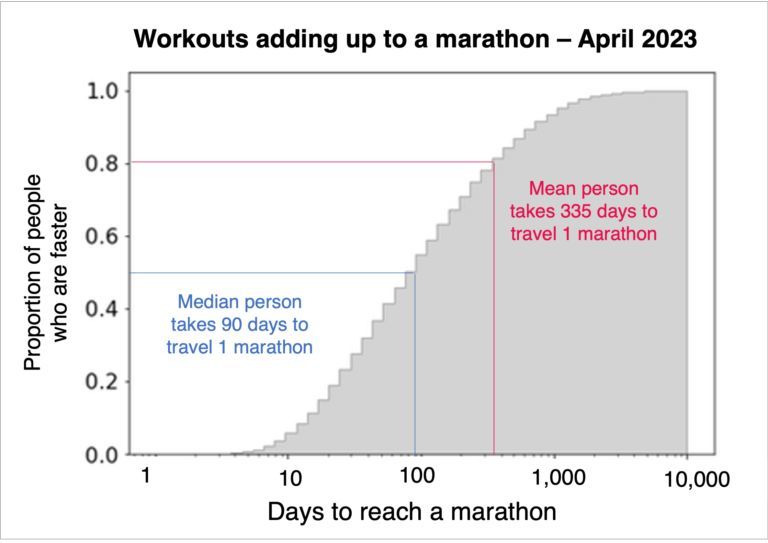 此外,我们还根据 76,114 名参与者的步行或跑步频率以及他们当月的旅行距离,估算了他们每人完成一次马拉松所需的天数。