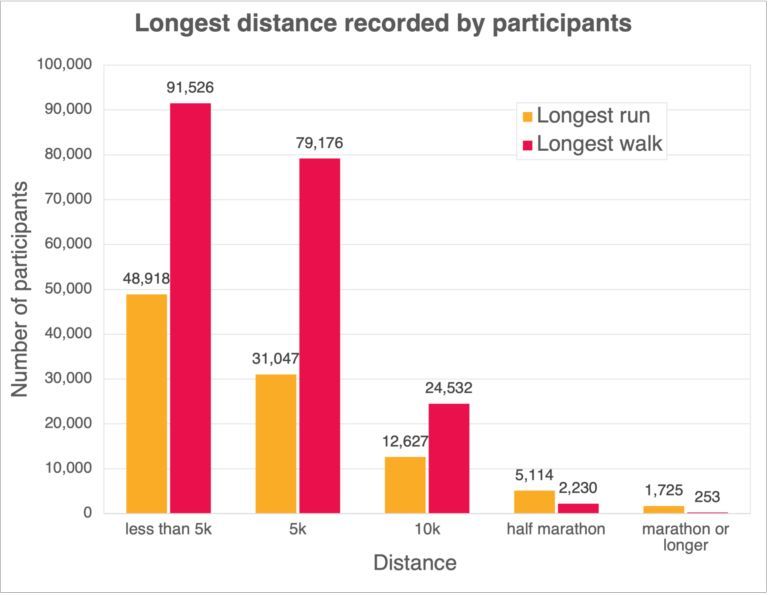 超过 50% 的参与者记录了这两种运动,在每个类别中至少有一次达到或超过 5 千米(5.0 千米 = 3.1 英里)的距离。