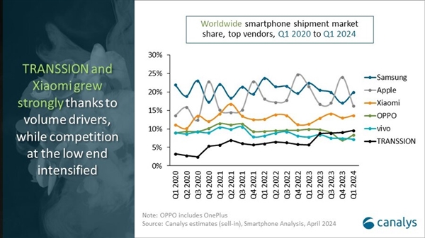 文章来源于互联网:快科技-2024年Q1全球智能手机出货量报告:三星重回第一 传音杀进前四