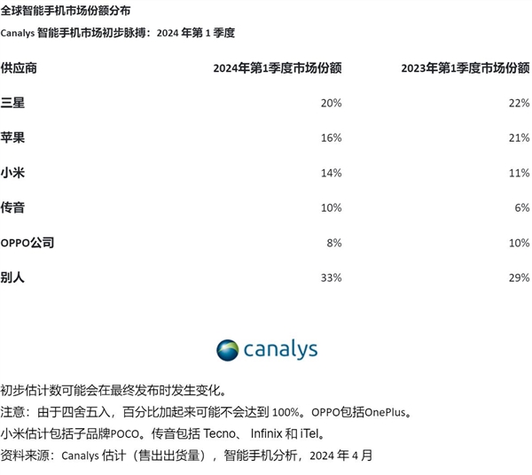 对比去年同期,三星2024年第一季度市场份额下降2%,苹果2024年第一季度市场份额下降5%,小米2024年第一季度市场份额增加3%,传音2024年第一季度市场份额增加4%,OPPO 2024年第一季度市场份额降低2%。