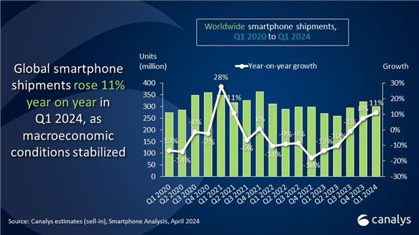 快科技4月16日消息,根据Canalys最新研究显示,2024年第一季度全球智能手机出货量同比增长了11%。这一增长趋势主要是由于消费者需求回升和全球宏观经济的复苏。