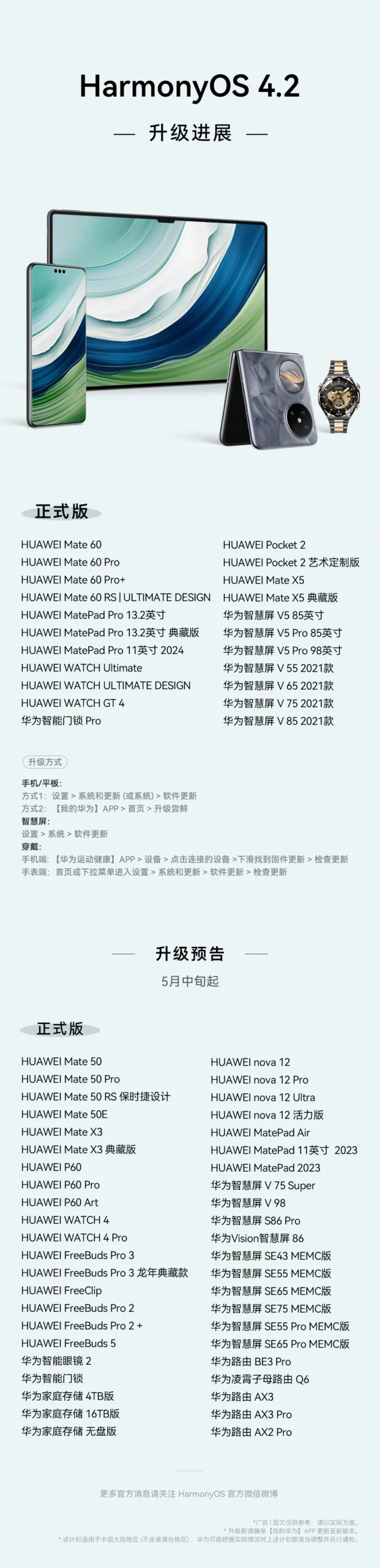 华为Mate 60 系列等11款机型全面开放鸿蒙HarmonyOS 4.2正式版升级,更多机型5月跟进