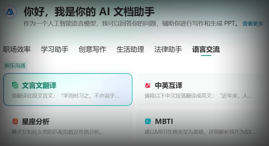 “AI 文档助手”功能丰富多样,涵盖了职场效率、学习助手、创意写作、生活助理、法律助手、语言交流等多个方面。在职场效率方面,用户可以利用该功能辅助编写工作计划、年终总结、策划方案等,大大提高了工作效率。同时,学习助手功能则针对学生和教师群体,可辅助写作作文范文、实践报告等,助力学习提升。