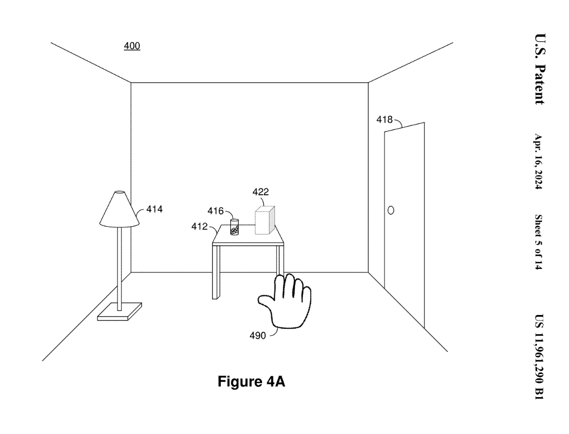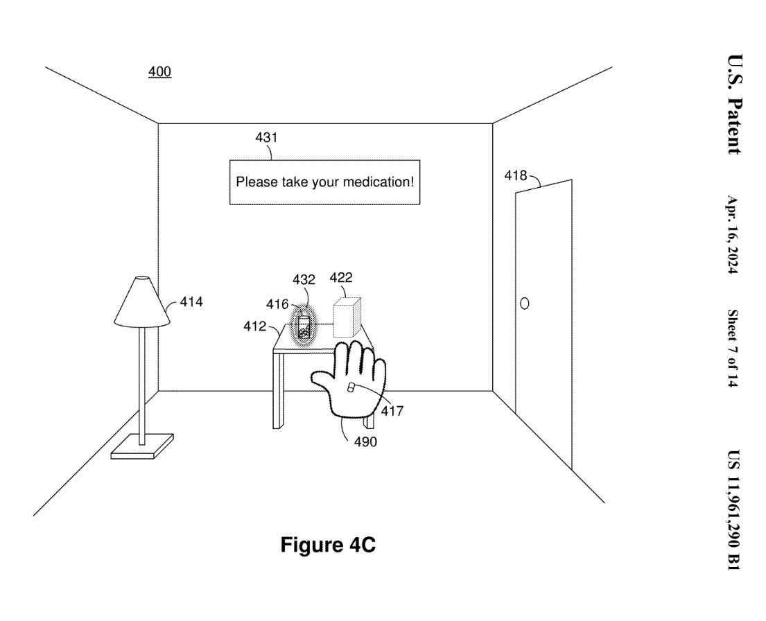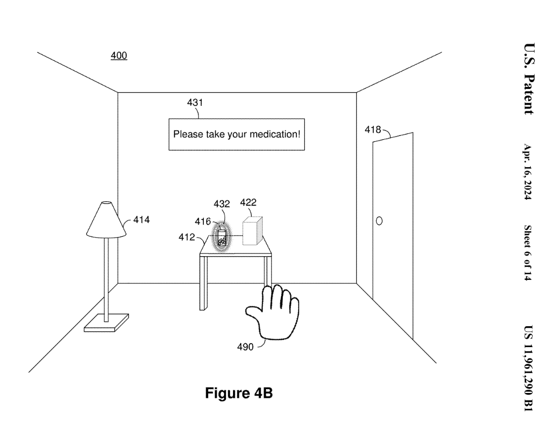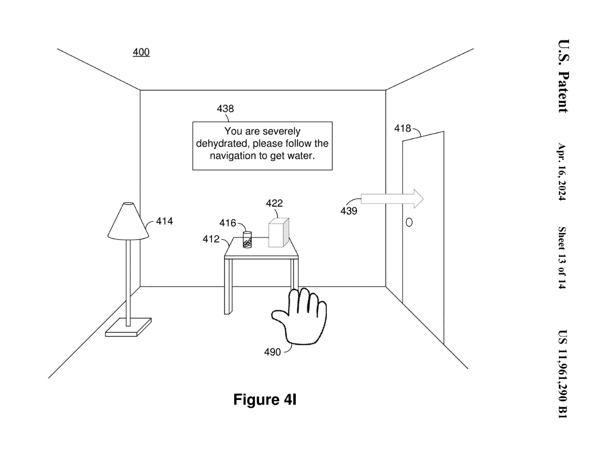IT之家附上苹果专利中一个举例,头显 / 眼镜设备检测到佩戴者忘记吃药,可以发出提醒并引导佩戴者寻找药瓶;例如检测到佩戴者处于缺水状态,提示佩戴者前往厨房倒水。