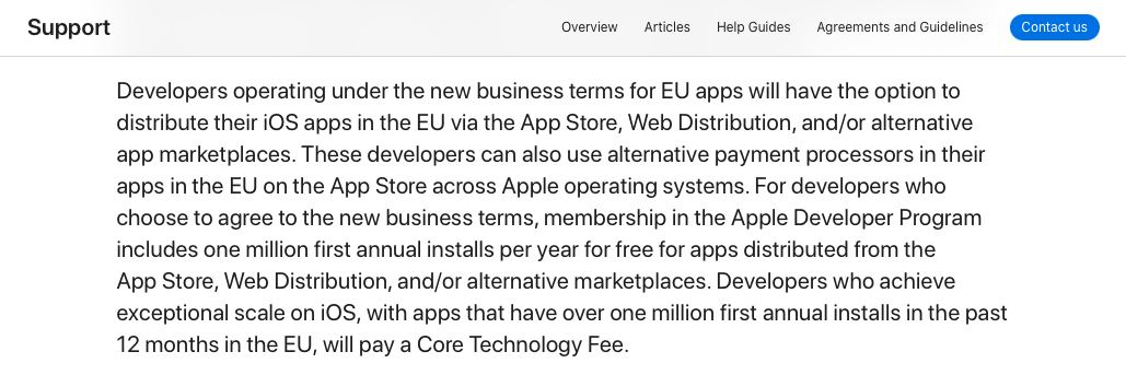 首先,开发者必须加入苹果开发者计划连续两年以上。并且在过去一年里,其 App 在欧盟地区需要拥有至少超过一百万次首次安装量。
