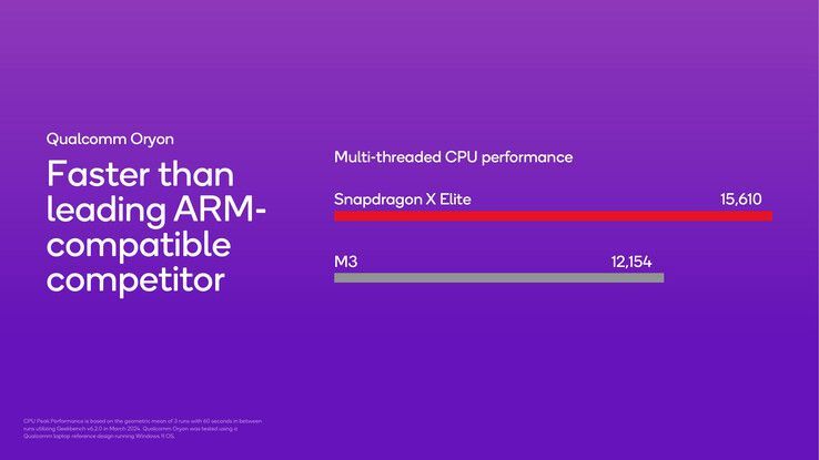 据介绍,骁龙 X Elite 处理器在 GeekBench 6.2 版本中的多核得分为 15610 分,比苹果 M3(12154 分)高出 28.4%。