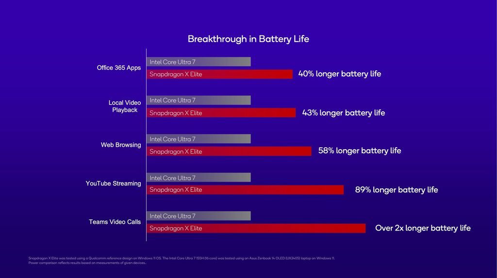 Microsoft 365 应用在骁龙 X Elite 平台上的续航时间比英特尔酷睿 Ultra 7 155H 笔记本电脑长 40%,播放本地电影的续航时间长了 43%,播放 YouTube 在线视频时间更是长了 89%。