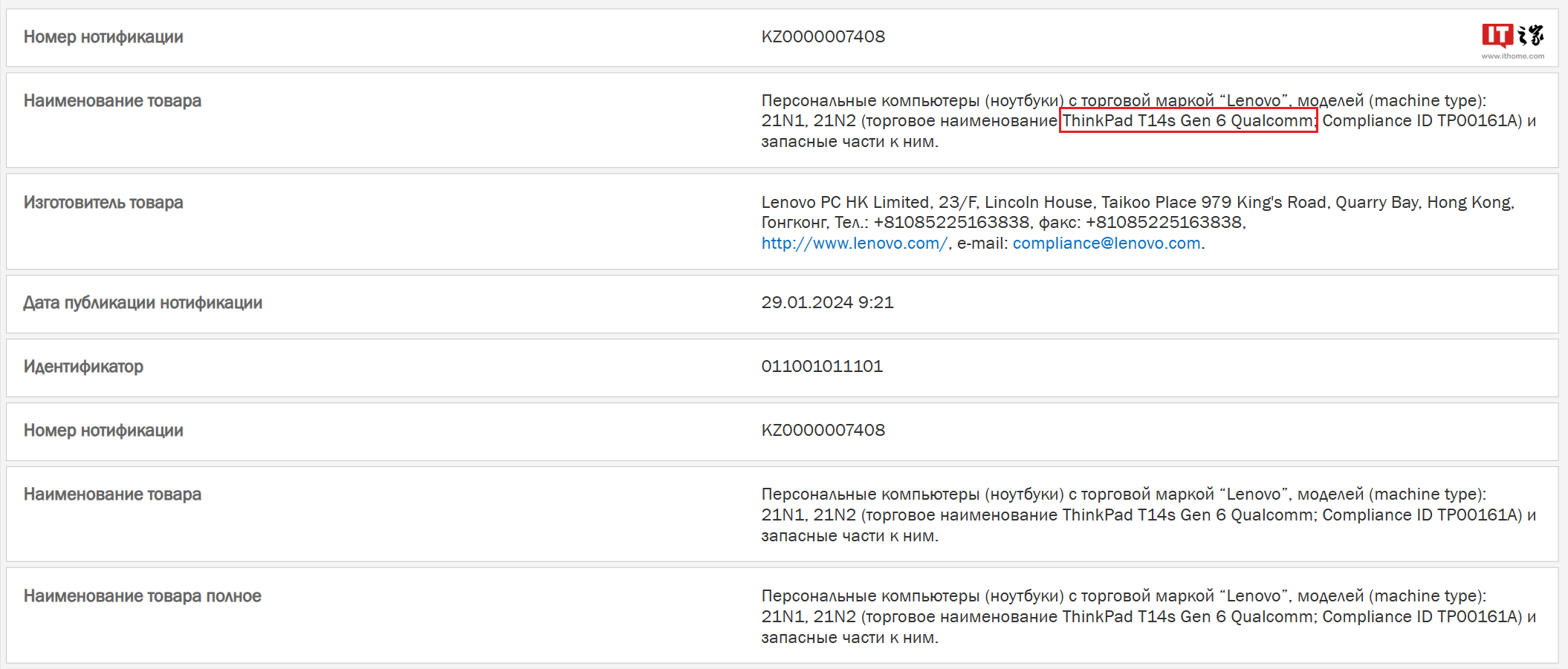 IT之家查询 EAE Union 认证发现,联想“ThinkPad T14s Gen 6 Qualcomm”笔记本已于 1 月通过认证,型号为 21N1 与 21N2,Compliance ID TP00161A。