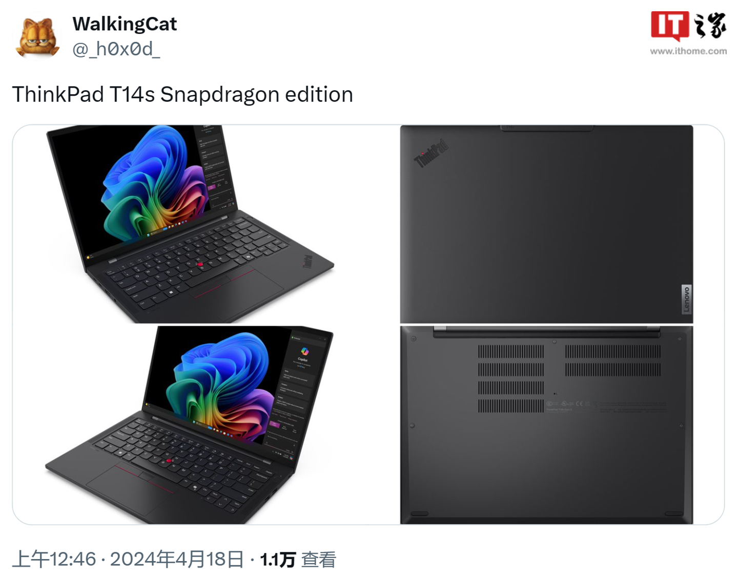 IT之家 4 月 18 日消息,继爆料联想 YOGA Slim 7 14 2024 骁龙版后,博主 @_h0x0d_ 放出了 ThinkPad T14s Gen 6 骁龙版笔记本电脑的渲染图,搭载骁龙 X Elite 芯片。