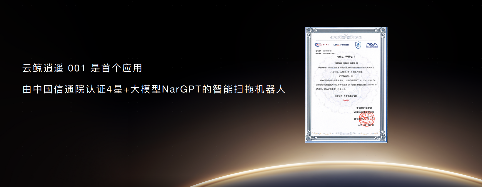 云鲸还其自主研发的多模态大模型NarGPT嵌入到新品中,获得中国信通院4星+认证的可信AI大模型,并顺利通过德国莱茵的安全隐私认证。据悉,云鲸逍遥001搭载NarGPT 全智能语音助手,支持单一口令、多意图、模糊意图、问答式聊天、召唤清洁等多种模型的自然语音交互,让人机交互变得极致简单。