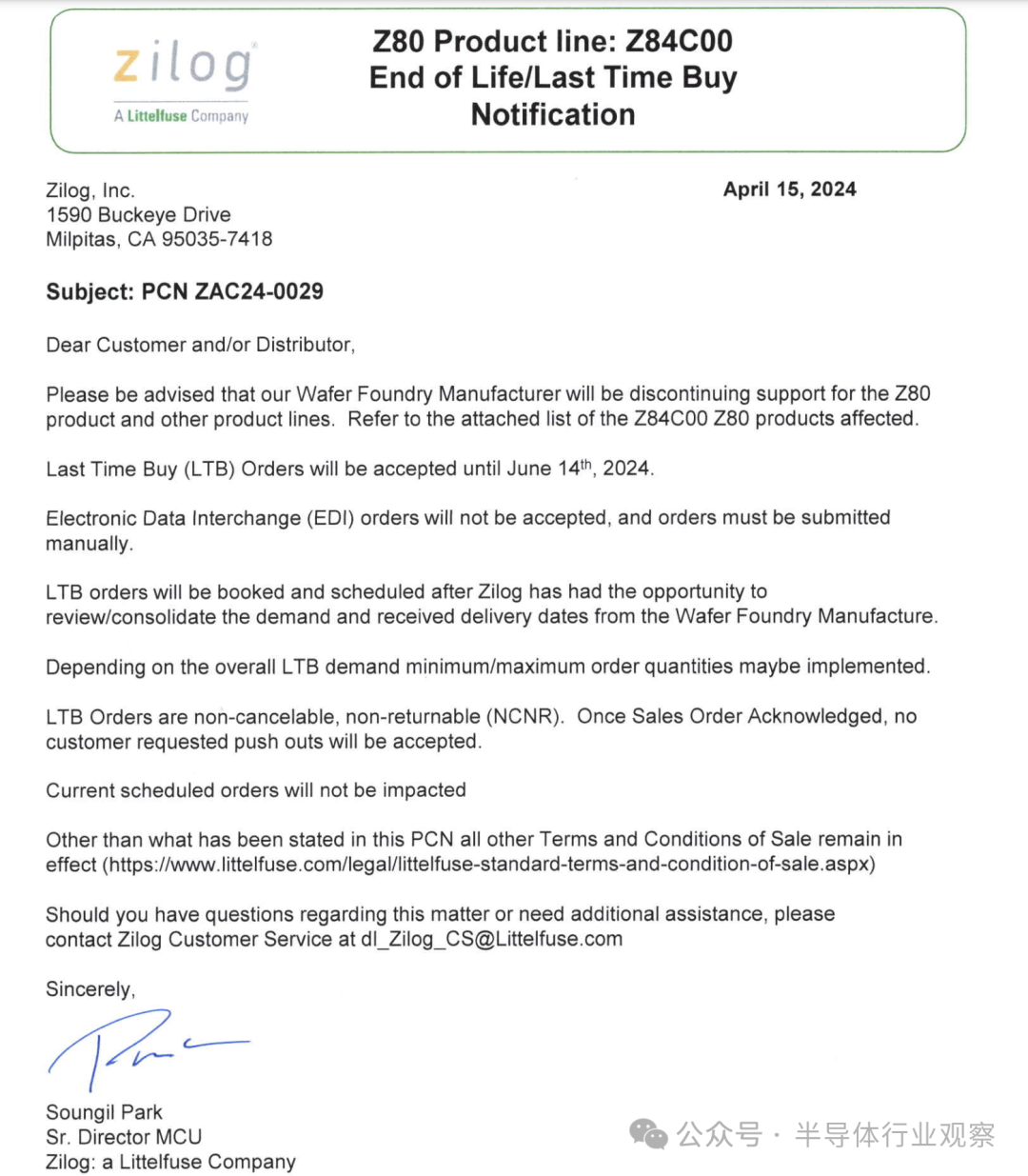 根据 Zilog 的通知,晶圆代工制造商 (WFM) 将于 6 月中旬停止接受剩余 Z80 产品的“最后一次购买”(LTB) 订单。Zilog 将根据客户需求处理和安排 Z80 的 LTB 订单,而 WFM 将在此后提供实际交货日期。根据 LTB 的总体需求,公司可能会对最小和最大数量提出更严格的要求。