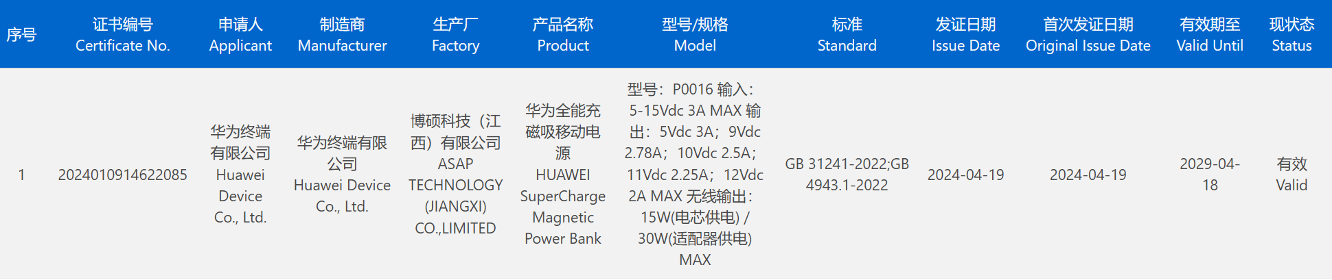 IT之家 4 月 21 日消息,日前,一款名为“华为全能充磁吸移动电源”的产品通过国内 3C 认证,预计将于近期发布。