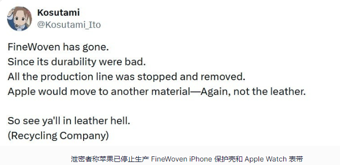 【环球网科技综合报道】据外媒消息,近日,有传言指出,苹果公司可能将停止使用其FineWoven材质的iPhone保护壳和Apple Watch表带。此消息源自一位Twitter上的爆料者,若属实,这将标志着苹果对这款去年秋天推出的环保替代材料的重大策略转变。