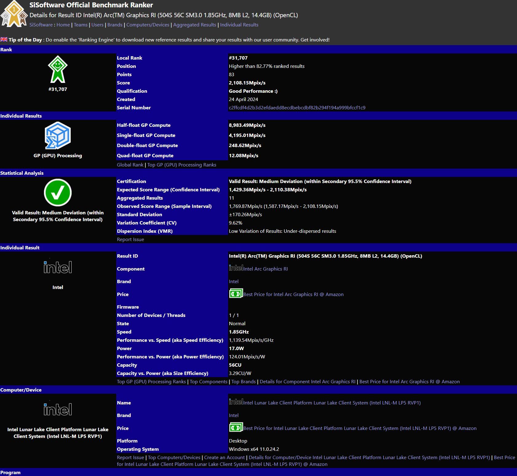Intel Meteor Lake 和 Arrow Lake iGPU 在 SiSoftware Sandra GPGPU 测试中得分约为 1000 分,而 Lunar Lake ES 芯片得分超过 2100 分。IT之家附上跑分截图如下: