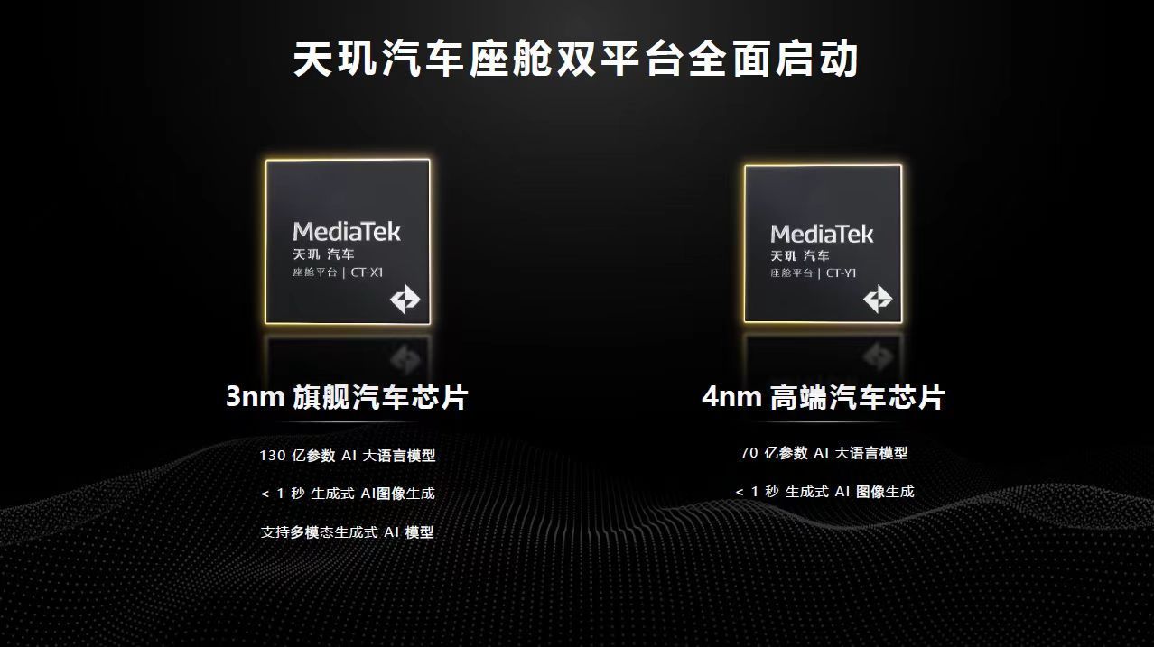 说回天玑 CT-X1,这颗芯片基于 3nm 打造,各种参数暂未公布,目前只知道它内置 AI 计算单元和端侧生成式 AI 轻量化技术,支持 130 亿参数的 AI 大语言模型,可在车内运行多种主流的大语言模型和 AI 绘图功能,支持基于 3D 图形界面的车载语音助手,提供丰富的多屏互动与显示技术、驾驶警觉性监测等先进的 AI 安全和娱乐应用。
