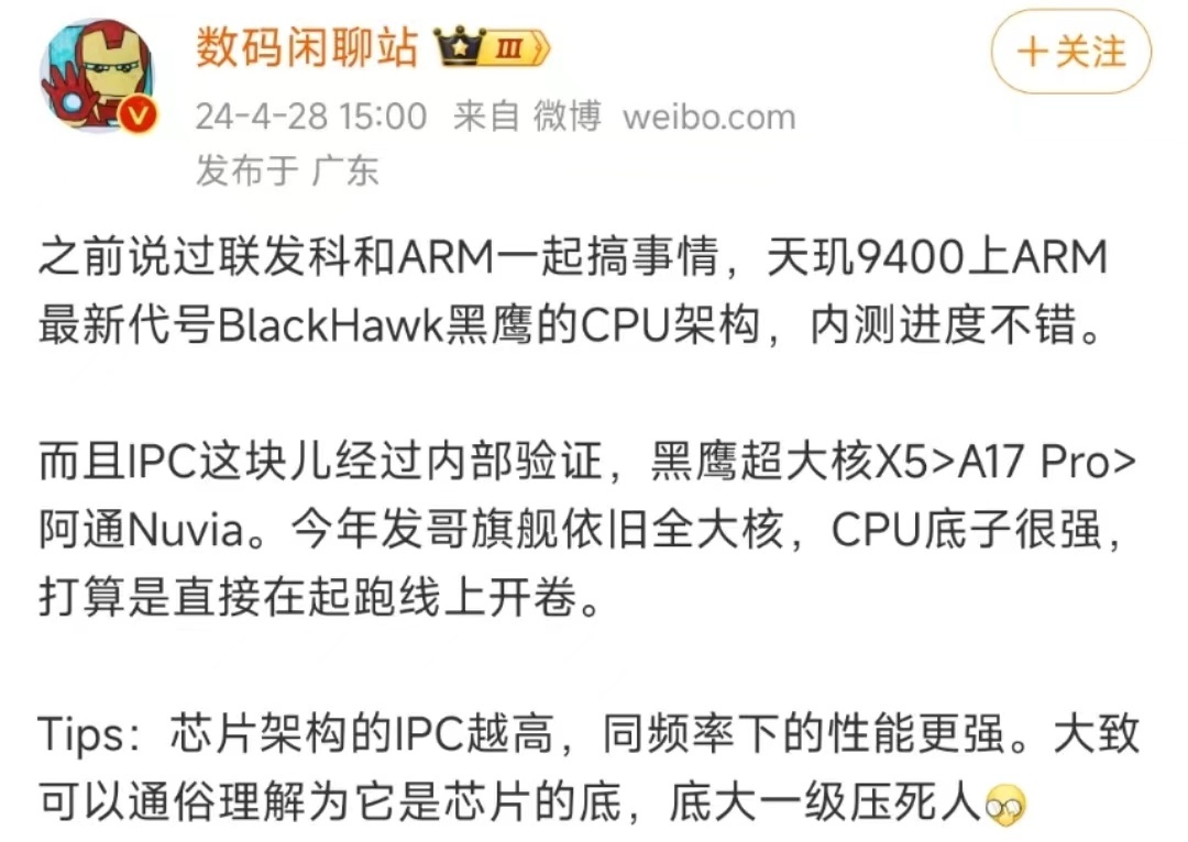 @数码闲聊站 之前爆料称,Arm 下代 CPU 架构代号为“黑鹰(BlackHawk)”,联发科下一代天玑 9400 也将会采用黑鹰架构,而且目前测试进度不错。他表示,黑鹰超大核的 IPC 甚至可以超过苹果 A17 Pro 以及高通 Nuvia 平台。