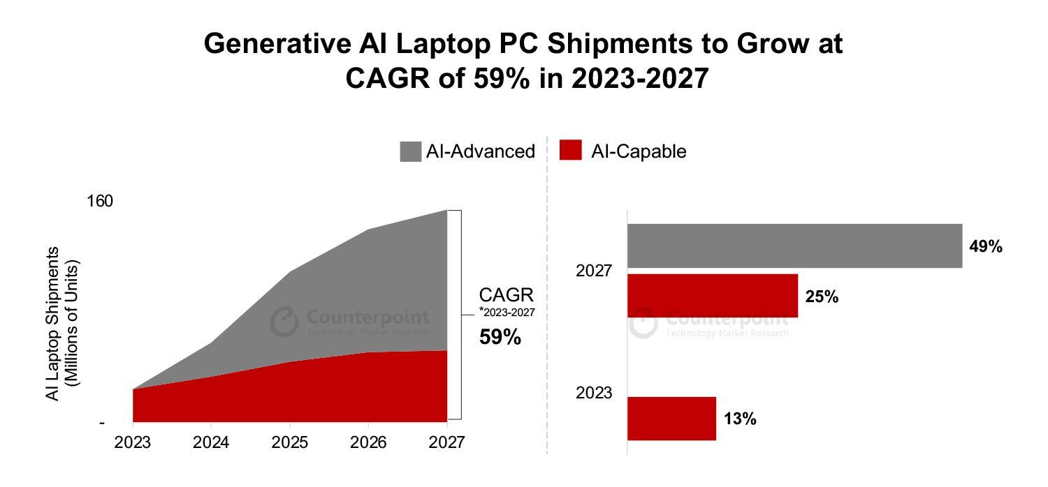 虽然 2023-2027 年整个笔记本电脑市场的复合年增长率约为 3%,但人工智能笔记本电脑领域的复合年增长率必将达到 59%。从计算到内存的先进半导体内容将推动与更新的 GenAI 功能相关的 ASP(平均售价)积极增长,为消费者带来比以前更多的价值。