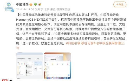 巧合的是,中国移动近日推出华为鸿蒙 HarmonyOS NEXT 版“移动云盘”原生 App,标志着“中国移动率先推出电信行业首个通过测试的鸿蒙原生应用核心版本”。