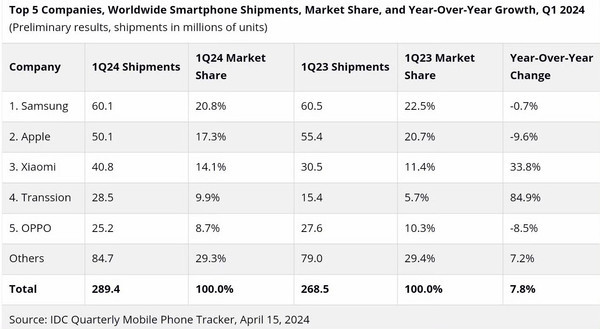 【CNMO科技消息】近日,IDC公布了2024年第一季度的全球手机销量数据。小米董事长雷军引用了这份数据,并宣布小米站稳全球手机销量TOP 3,还实现超过33%的同比增长。而与此同时,不少网友注意到,一家名为Transsion(传音)的厂商居然已悄悄成为了全球第四大手机厂商,销量甚至超过了我们熟悉的OPPO、vivo、华为、荣耀。