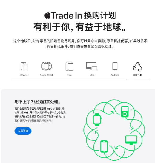 苹果公司在其更新页面上明确表示:“这个地球日,让你手里的旧设备物尽其用。”该公司鼓励用户通过换购计划,用手中的旧设备换取购置新设备时的折抵优惠。对于那些不符合折抵条件的设备,苹果也提供了免费回收处理服务。