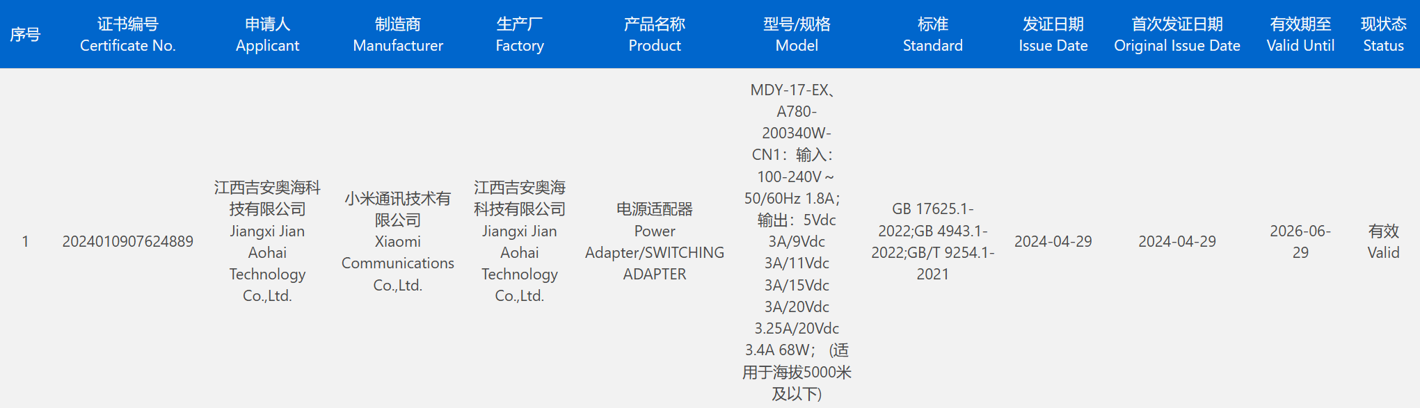 IT之家 5 月 3 日消息,日前,小米旗下一款新品充电器通过了国内 3C 认证,支持 68W 快充,适用于海拔 5000 米及以下。