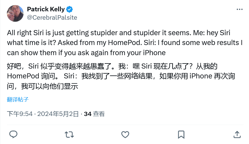 苹果公司随后表示部分修复了这个问题,用户询问“what time is it?”(现在几点了),可以收到准确的信息,但换个问法“what’s the time?”或者“can you tell me the time?”,Siri 就会卡壳了。