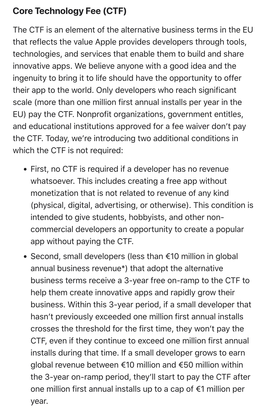 苹果同期引入两个无需支付 CTF 核心技术费的条款: