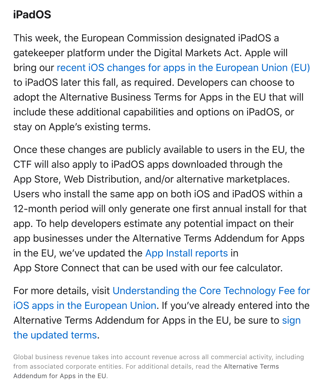 苹果表示,一旦这些更改向欧盟用户公开发布,CTF 核心技术费也将适用于通过 App Store、网络渠道分发、其他市场下载的 iPadOS 应用。在 12 个月内同时在 iOS 和 iPadOS 上安装同一 App 的用户,每年只会为该 App 生成一次首次安装。