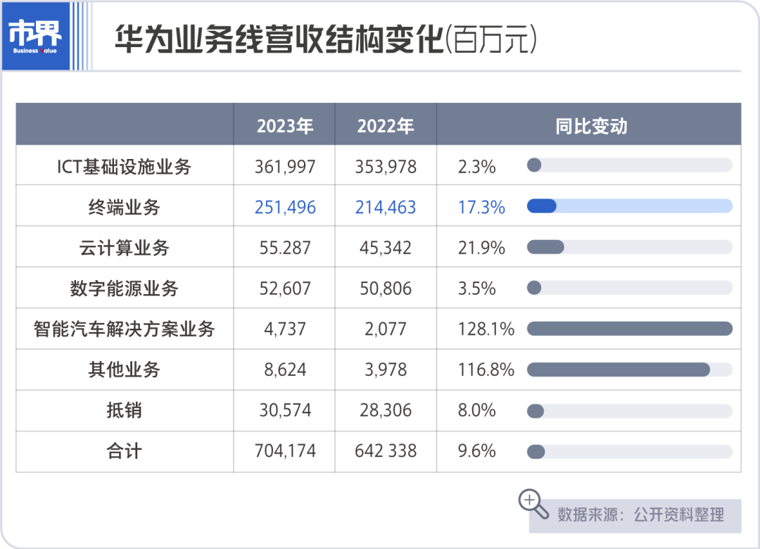 在多款机型同步热销的推动下,华为终端收入迎来大涨。不久前,华为公司发布了2023年年度报告,报告显示:2023年华为终端业务销售收入2515亿元人民币,同比增长17.3%,迎来近三年首次正增长。