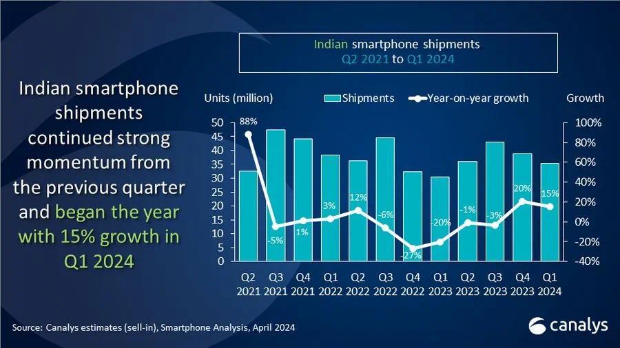 IT之家 4 月 19 日消息,市场调查机构 Canalys 近日发布报告,表示 2024 年第 1 季度印度智能手机出货量达到 3530 万台,同比增长 15%。