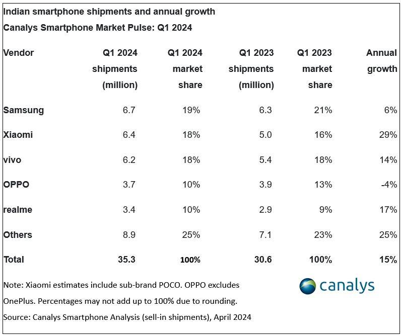 原标题:24Q1印度手机出货量报告:三星增6%、小米增29%、vivo增 14%、OPPO降 4%、realme增17%