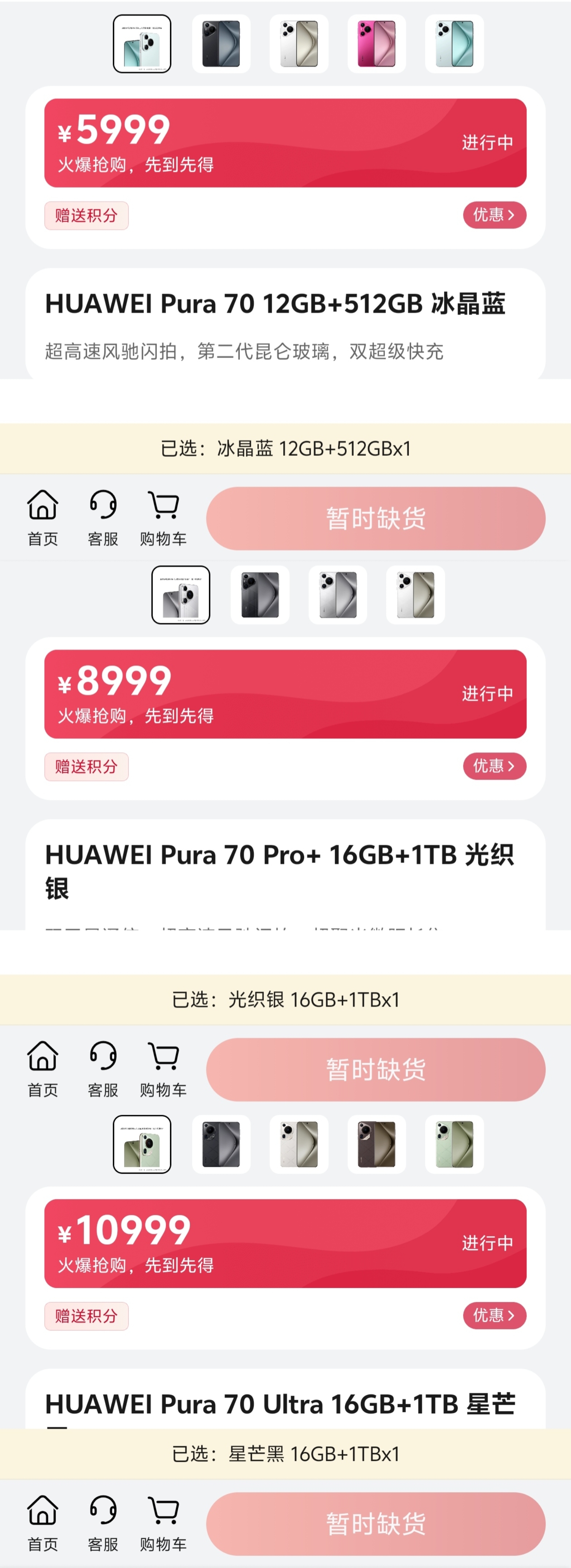 目前,华为商城显示Pura 70 Ultra、Pura 70 Pro+、Pura 70 Pro、华为Pura 70均为缺货状态。