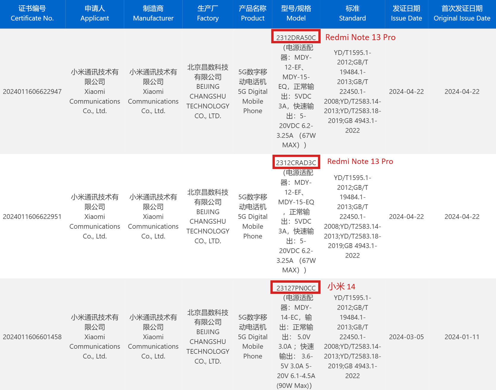 IT之家 4 月 25 日消息,由北京昌数科技有限公司,即小米北京昌平智能工厂生产的 Redmi Note 13 Pro 手机(2312DRA50C / 2312CRAD3C)现已通过 3C 认证。