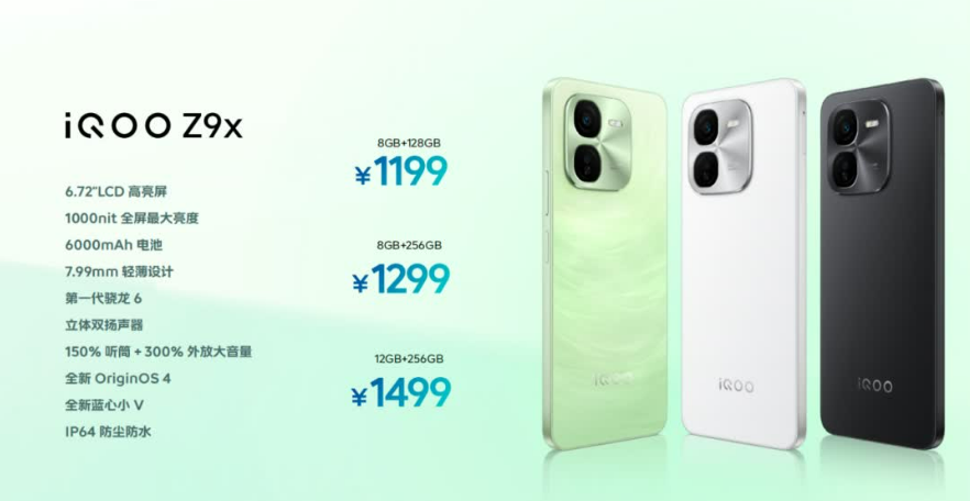 iQOO Z9x共有星芒白、曜夜黑以及风羽青三款配色,价格为1199元(8GB+128GB)、1299(8GB+256GB)、1499元(12GB+256GB),采用6000mAh大电池,支持IP64防尘防水。