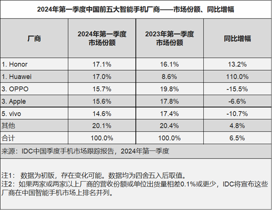 2024年带一季度中国前五大智能手机厂商——市场份额、同比增幅(图源:IDC)