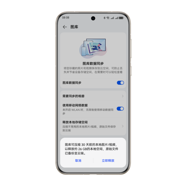 此外,在日常用机过程中,随着拍摄的照片和视频越来越多,大家的手机经常面临存储空间不足的情况。华为云空间的图库数据同步功能能更有效解决这一难题,它可以减少不常用本地照片所占用的空间,只保留高清缩略图在本地图库,原图则保存在云端,一键释放本地存储空间,帮你摆脱存储不足的烦恼。