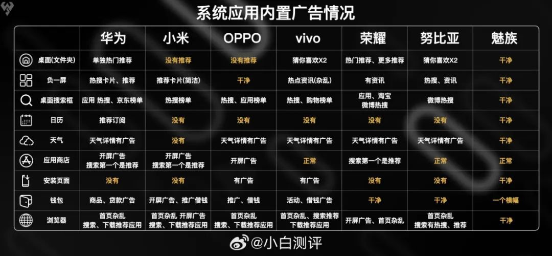 图2 是各家系统应用内置广告的具体情况,负一屏、桌面搜索框、天气、钱包等界面来说,魅族最干净。