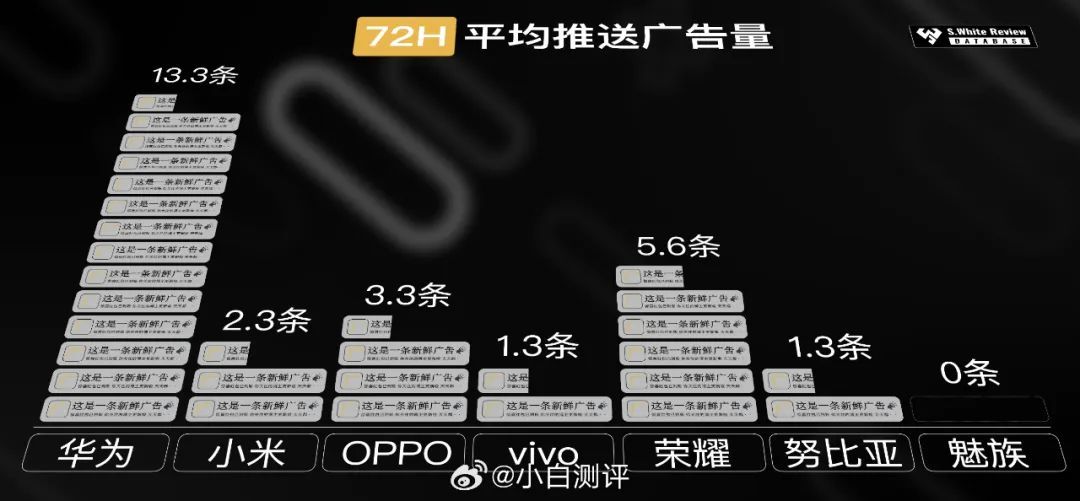 图1 是静置手机72小时后平均每天推送的广告数量,华为最多。