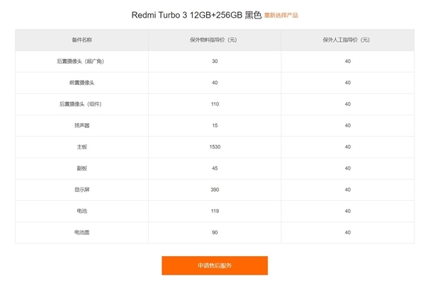 快科技5月2日消息,小米商城公布了Redmi Turbo 3保外维修价格。