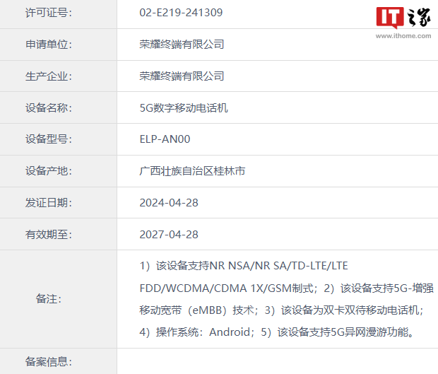 IT之家 5 月 3 日消息,日前,有一款型号为 ELP-AN00 的荣耀新机在工信部完成入网并通过无线电核准,预计为荣耀 200 系列。