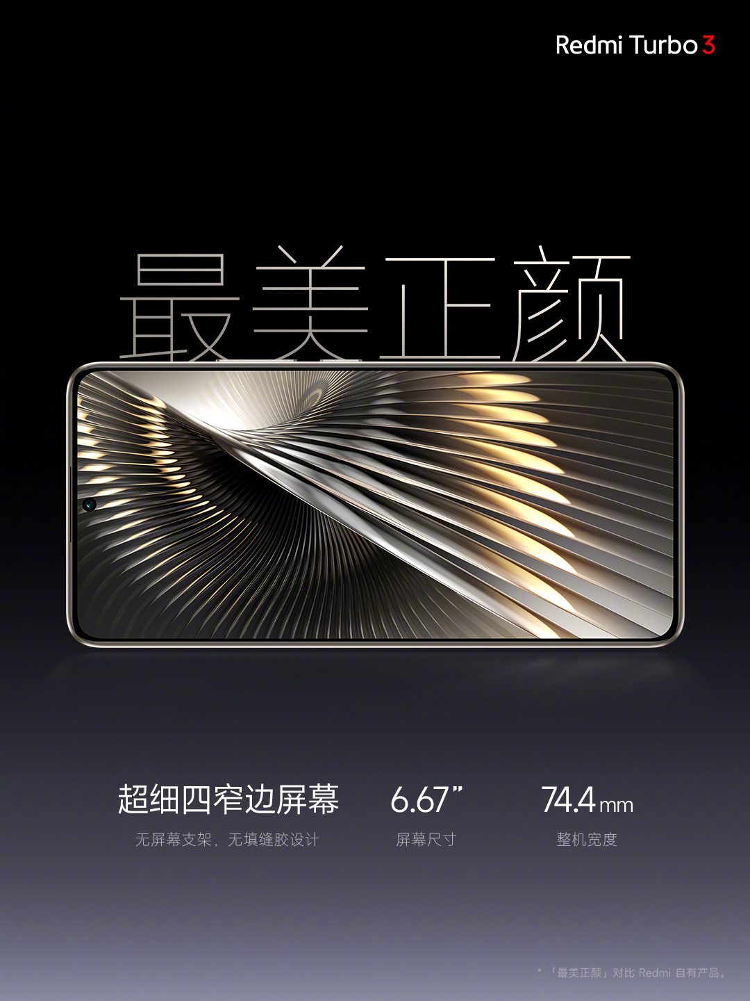 外观方面,Redmi Turbo 3 将提供墨晶、青刃、冰钛三款配色以及哈利・波特版,采用直角边框、三边等宽设计,机身背面采用等深四曲设计,采用无塑料支架直屏设计。